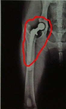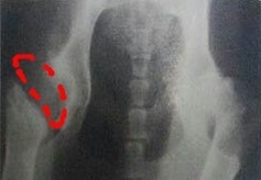 图中所示红线划分出了股骨头在髋臼内的股骨头,大约只占股骨头的1/4,属于严重的髋关节发育异常