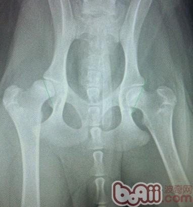 此X光片为数码片,通过图中的绿色测量线可发现左侧的股骨头和右侧的股骨头在关节窝里的面积明显不同,但是由于拍摄此片时患犬未镇静麻醉,所以摆位不正,不能作为确诊的理由,所以建议还是在患犬肌肉放松的情况下拍片。