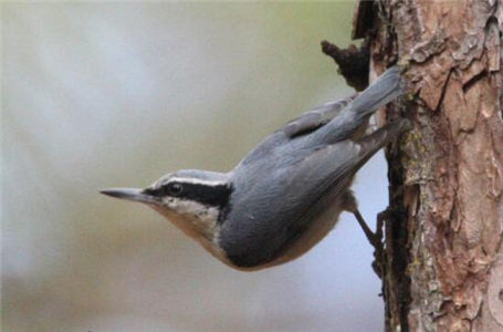 雌鸟和雄鸟相似,但上体蓝色浅淡,头顶杂有灰褐色,黑色贯眼纹不如雄鸟黑亮,额后缘白纹沾棕。